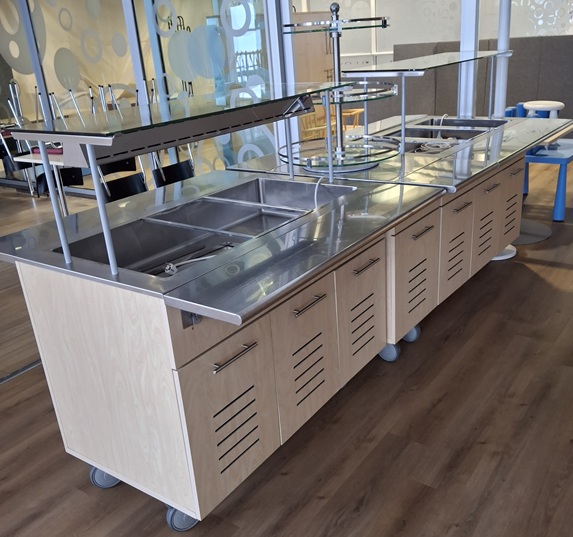 Lämpöhauteessa lämpösäteilijä. Välipöytä 460×6560/1150×900/1280. Välipöydällä astiateline.